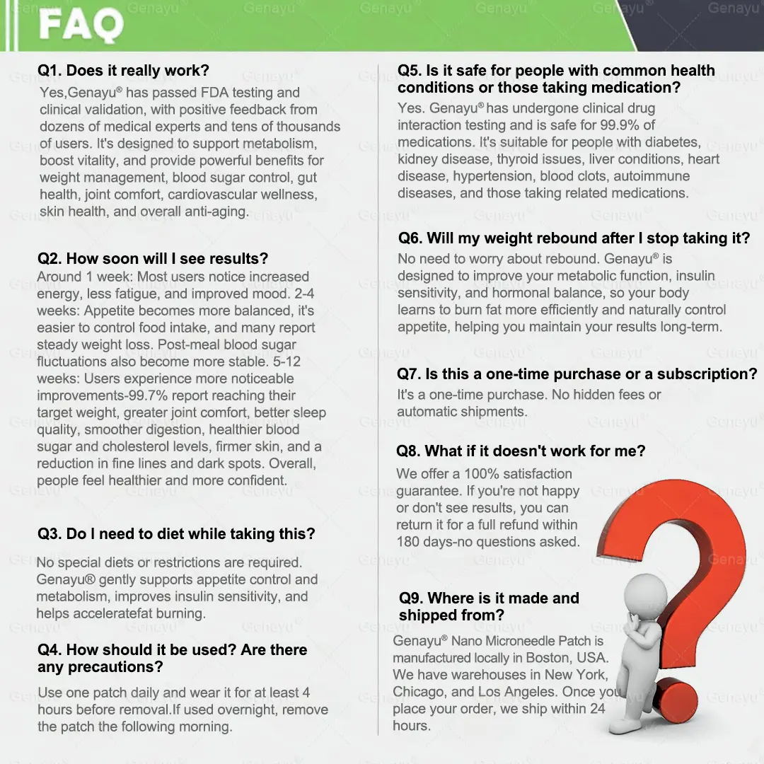 ✅ 𝐆𝐞𝐧𝐚𝐲𝐮® 10-in-1 Advanced Nano Microneedle Patch: Rompiendo con la carga de los productos inyectables u orales tradicionales para perder peso, este avanzado sistema de administración transdérmica mediante microagujas nano libera los ingredientes activos de forma suave y constante hasta por 8 horas. Los ingredientes clave, Moringa y Berberina, actúan de forma sinérgica para apoyar el control del apetito y el metabolismo de los lípidos, haciendo que la pérdida de grasa se sienta natural y sin esfuerzo. Al mismo tiempo, el NAD⁺ mantiene los niveles de energía celular y la firmeza de la piel. La fórmula general es suave y estable, ofreciendo una experiencia cómoda, no irritante y no inyectable.